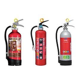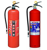 消火薬剤(淡紅色)は重炭酸ナトリウム又はリン酸アンモニウムを主成分とし、窒素ガス又は圧縮空気と共に密封されていて、レバーを握るとバルブが開き、 消火薬剤が放射されます。 優れた抑制作用によって「普通火災」、「油火災」に適応し、また、薬剤は電気の不良伝導体なので「電気火災」にも適応します。現在では、蓄圧式が多く設置されています。