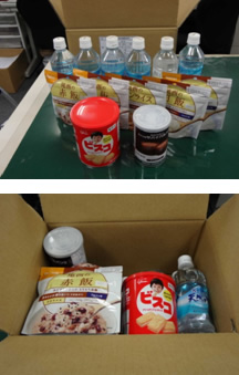 ライフラインの使用不能に伴う飲料水及び食糧を保管する備蓄品。配付及び維持管理が容易なように、1箱に一人3日分をパックしました。